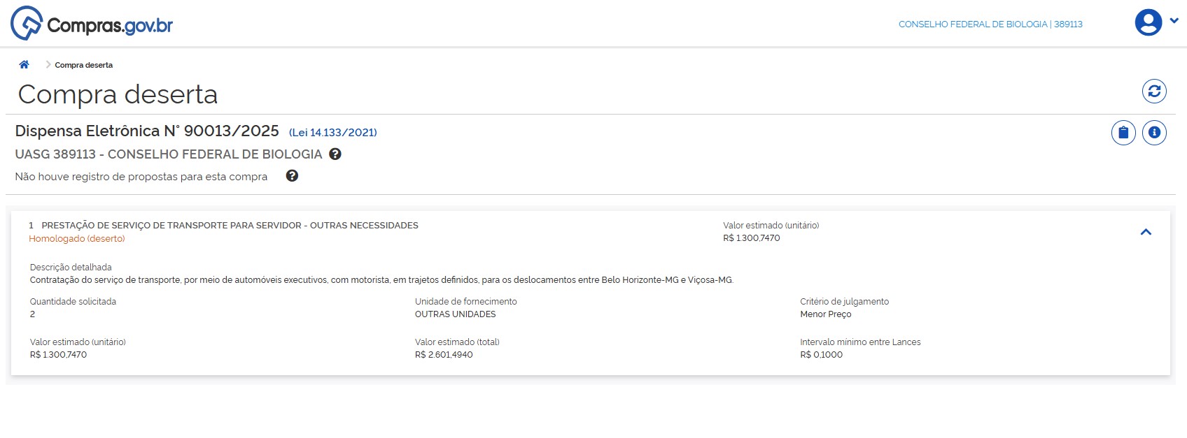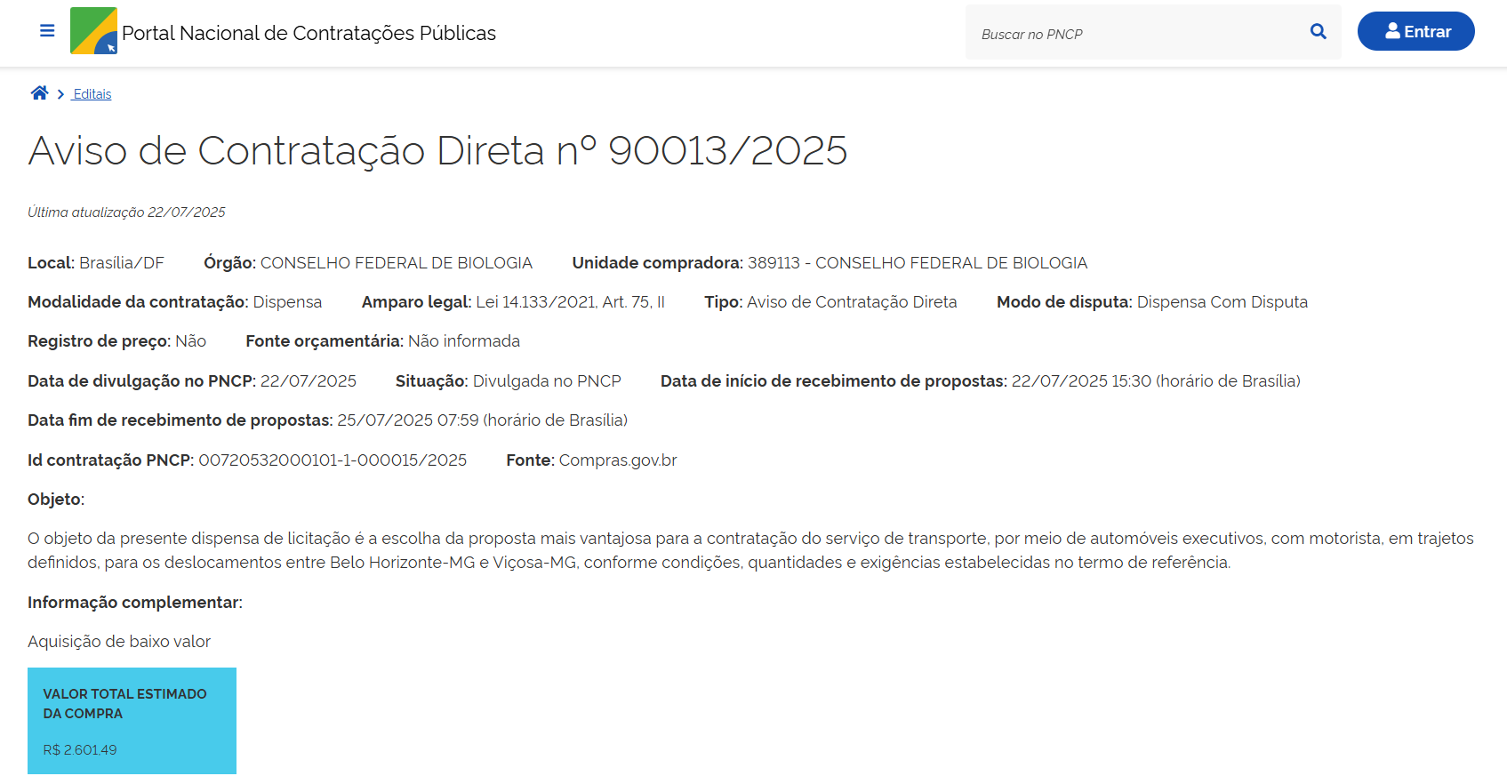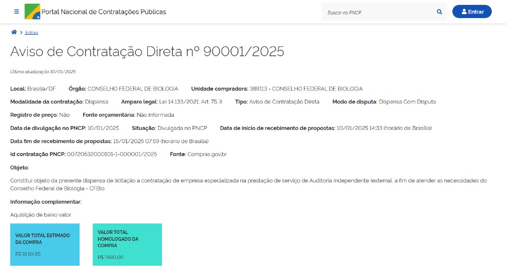 - Objeto: contratação de empresa especializada na prestação de serviço de Auditoria Independente (externa), a fim de atender as necessidades do Conselho Federal de Biologia - CFBio.