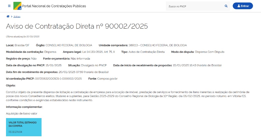 - Objeto: contratação de empresa para a locação de imóvel, prestação de serviços e fornecimento de itens inerentes à realização da cerimônia de posse dos novos Conselheiros eleitos, titulares e suplentes, para Gestão 2025-2029 do Conselho Regional de Biologia da 10ª Região, dia 05/02/2025, no período noturno, em Vitória/ES.