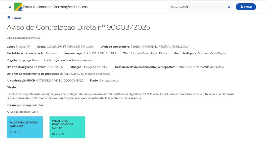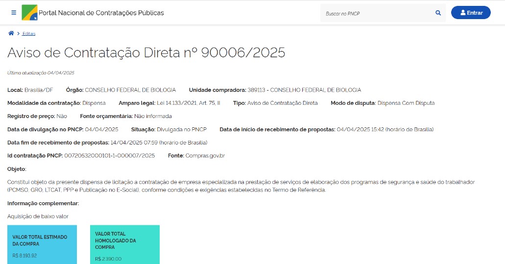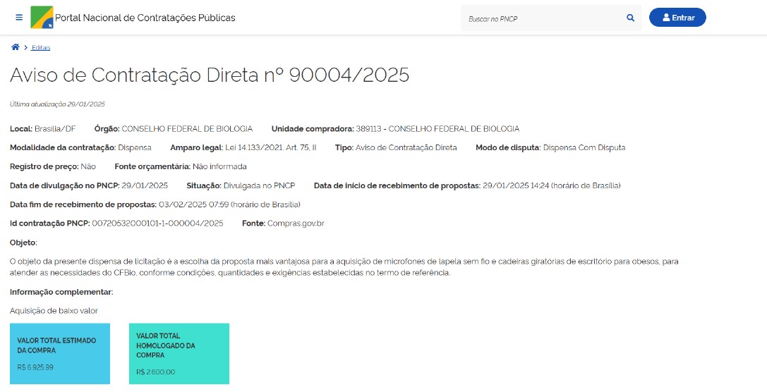 - Objeto: Contratação de assessoria jurídica temporária para orientações específicas referentes ao processo de eleição e posse dos conselheiros do Conselho Federal de Biologia (CFBio) para o mandato do quadriênio 10 de janeiro de 2024 a 09 de janeiro de 2028.