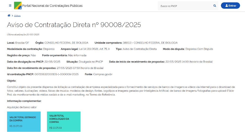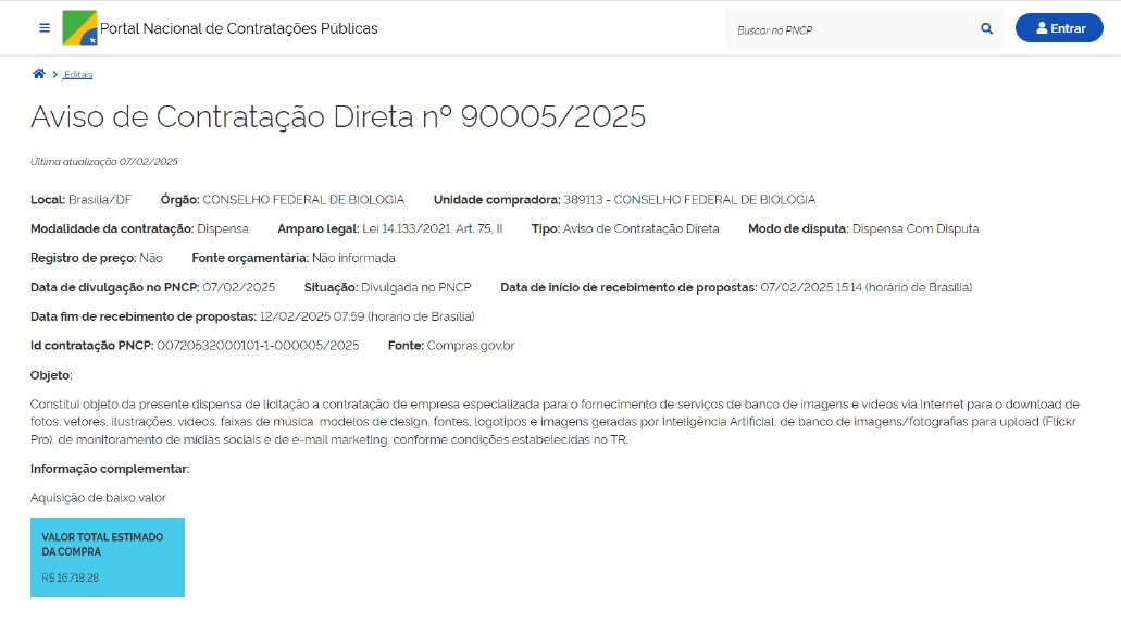 - Objeto: contratação de empresa especializada para o fornecimento de serviços de banco de imagens e vídeos via Internet para o download de fotos, vetores, ilustrações, vídeos, faixas de música, modelos de design, fontes, logotipos e imagens geradas por Inteligência Artificial, de banco de imagens/fotografias para upload (Flickr Pro), de monitoramento de mídias sociais e de e-mail marketing, nos termos da tabela abaixo, conforme condições e exigências estabelecidas no termo de referência.