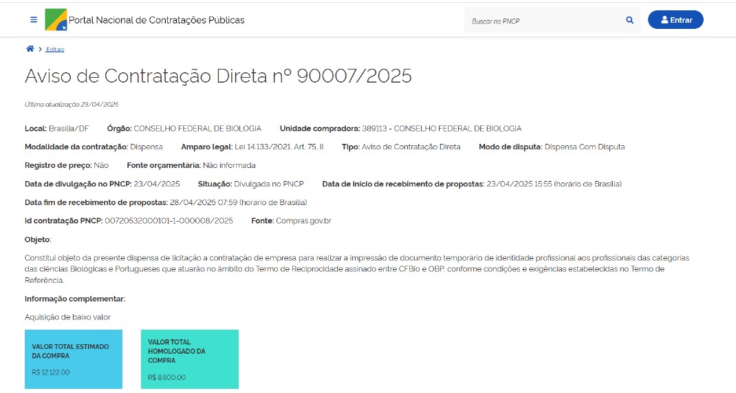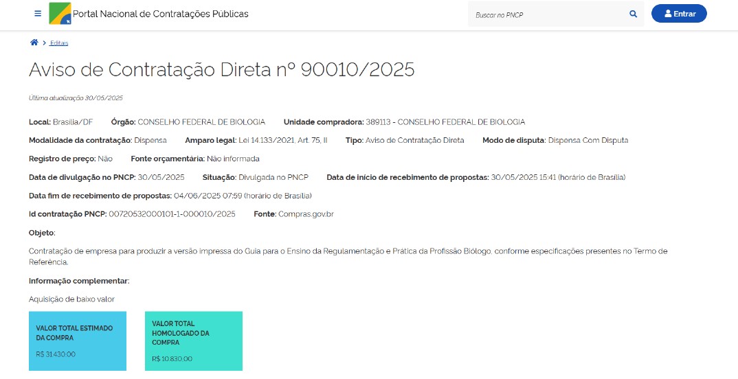 - Objeto: Contratação de Empresa para confecção de cinco mil exemplares da Legislação do Biólogo.