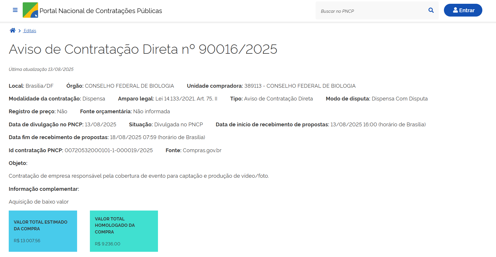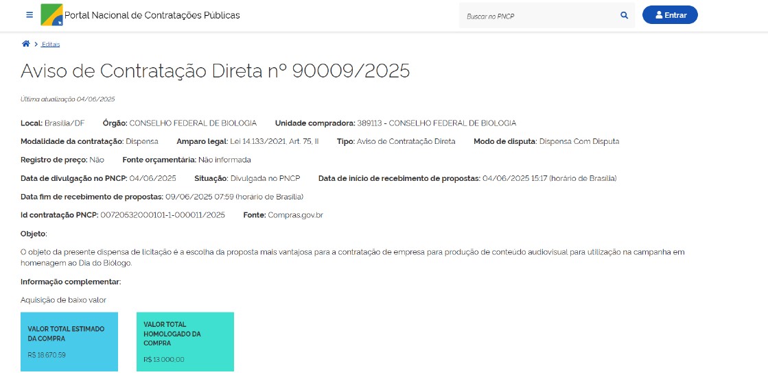 - Objeto: Contratação de empresa para produção de vídeo em homenagem ao dia do Biólogo.