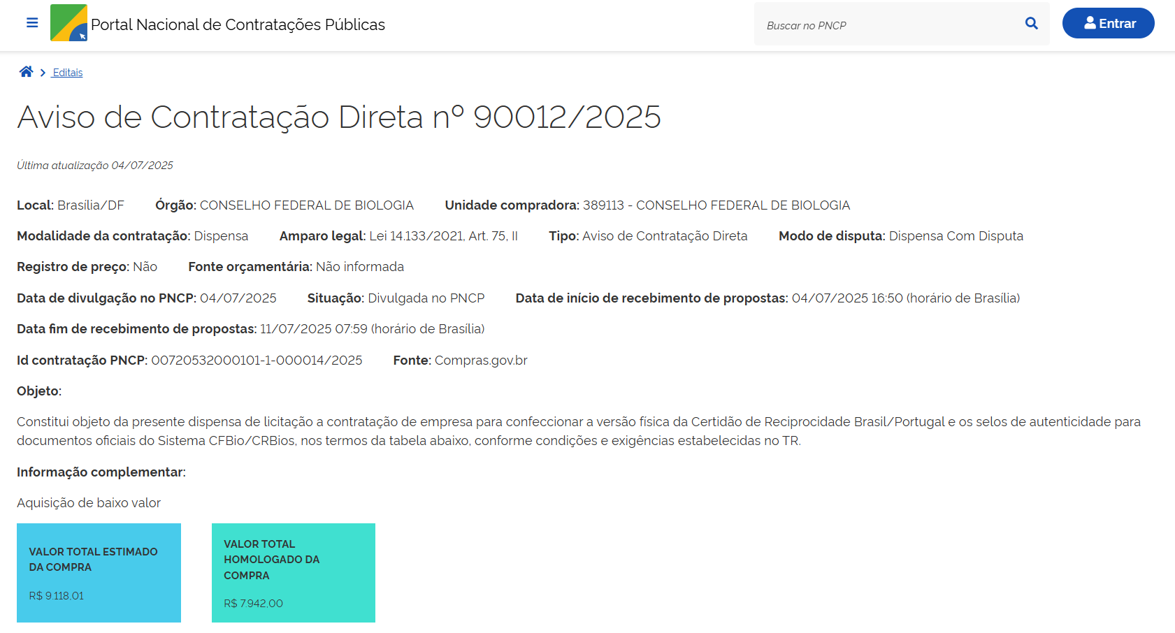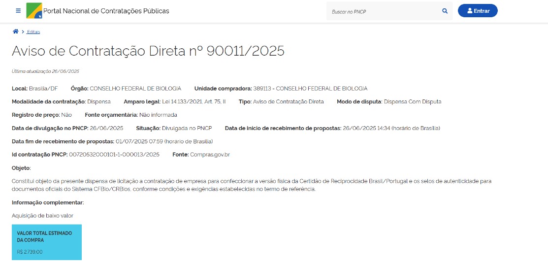 - Objeto: contratação de empresa para confeccionar a versão física da Certidão de Reciprocidade Brasil/Portugal e os selos de autenticidade para documentos oficiais do Sistema CFBio/CRBios.