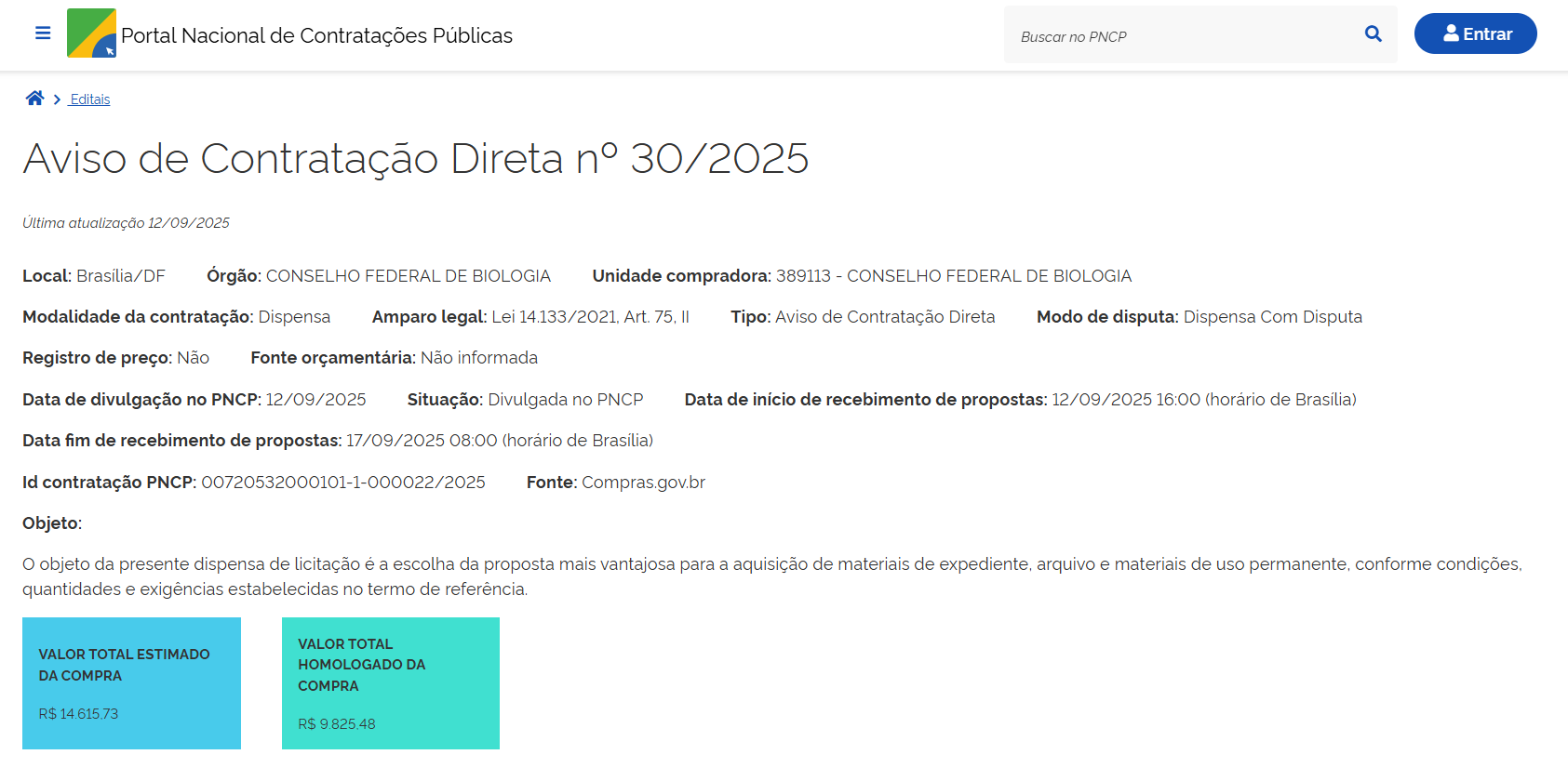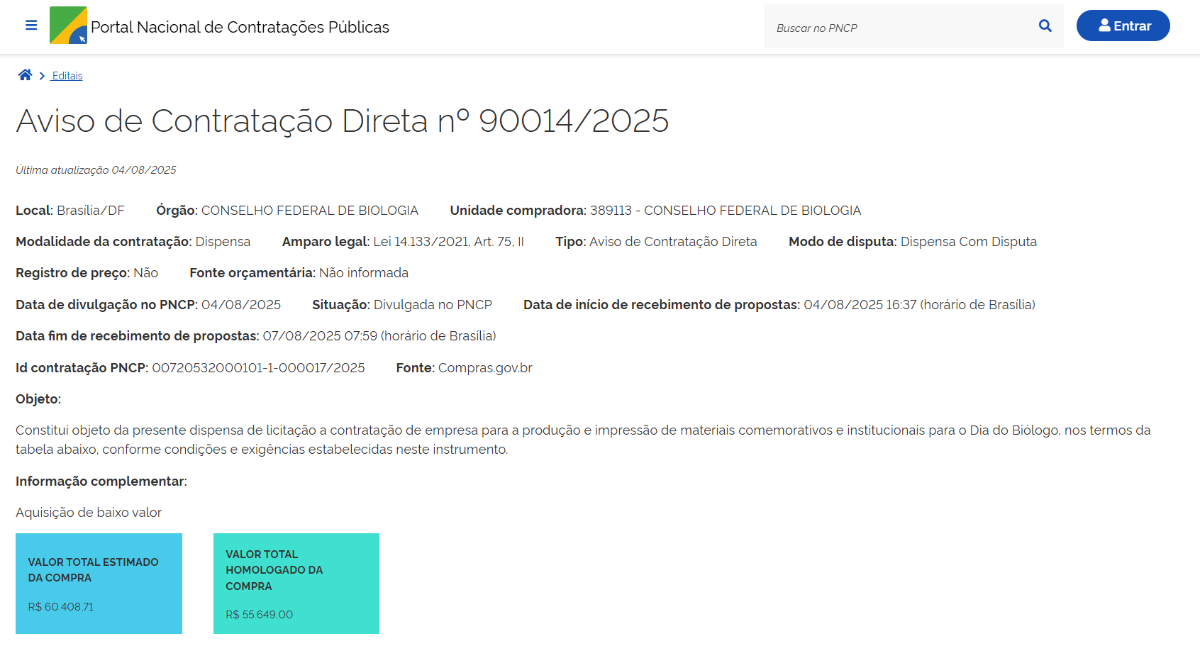 - Objeto: contratação de empresa para a produção e impressão de materiais comemorativos e institucionais para o Dia do Biólogo.