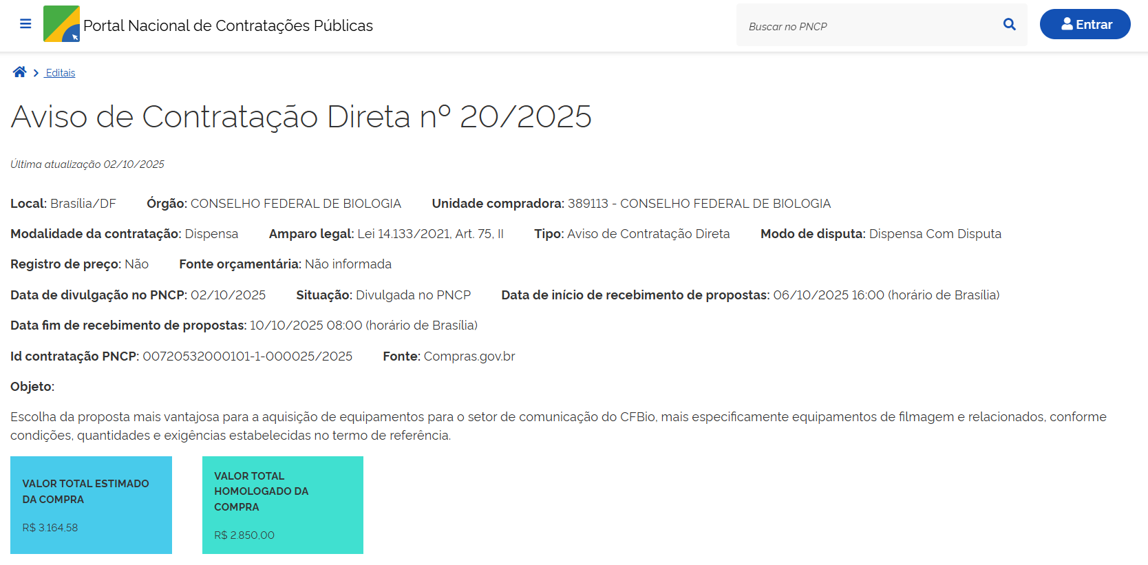- Objeto: aquisição de equipamentos para o setor de comunicação do CFBio, mais especificamente equipamentos de filmagem e relacionados.