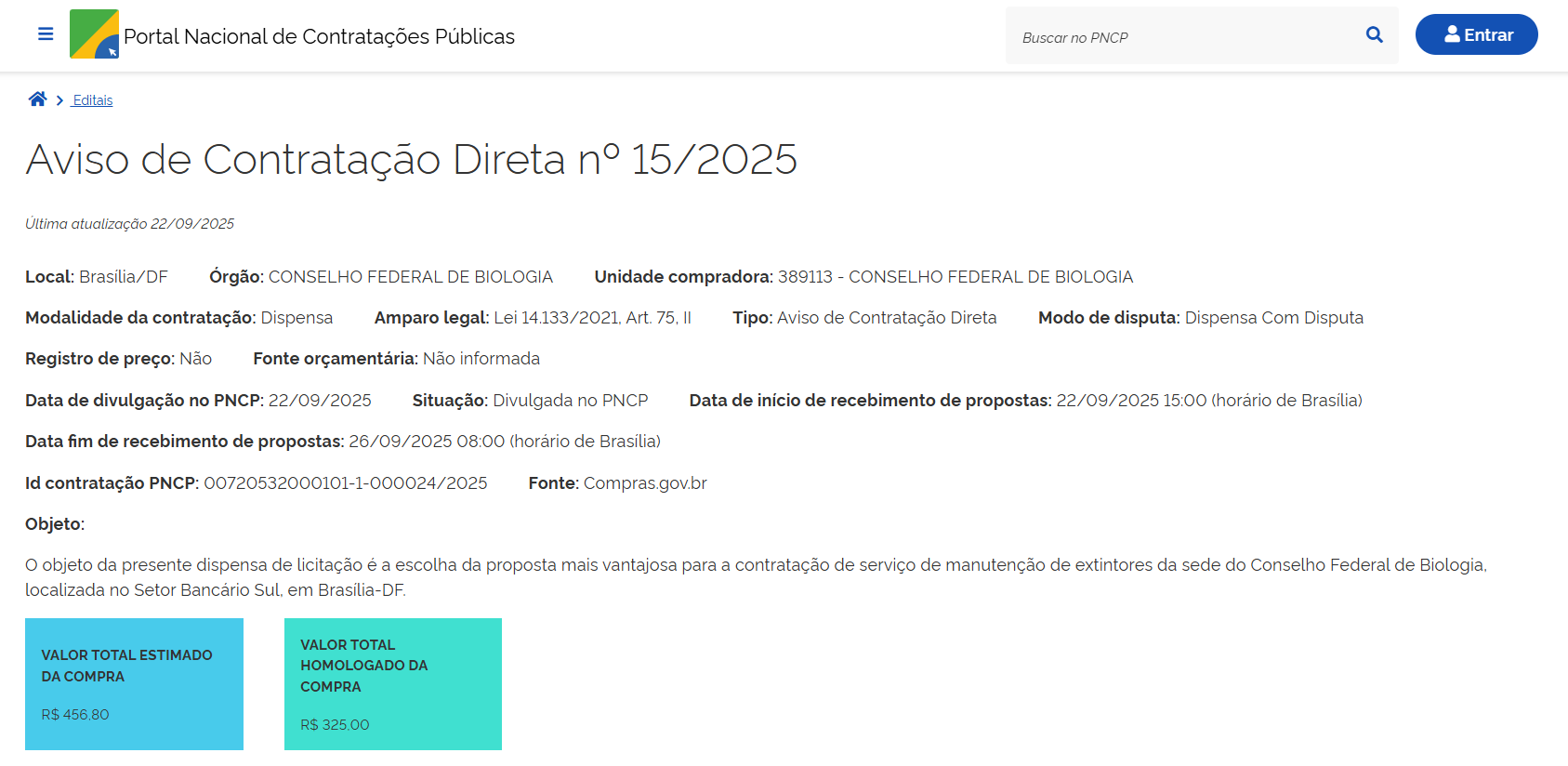 - Objeto: contratação de serviço de manutenção de extintores da sede do Conselho Federal de Biologia, localizada no Setor Bancário Sul, em Brasília-DF.