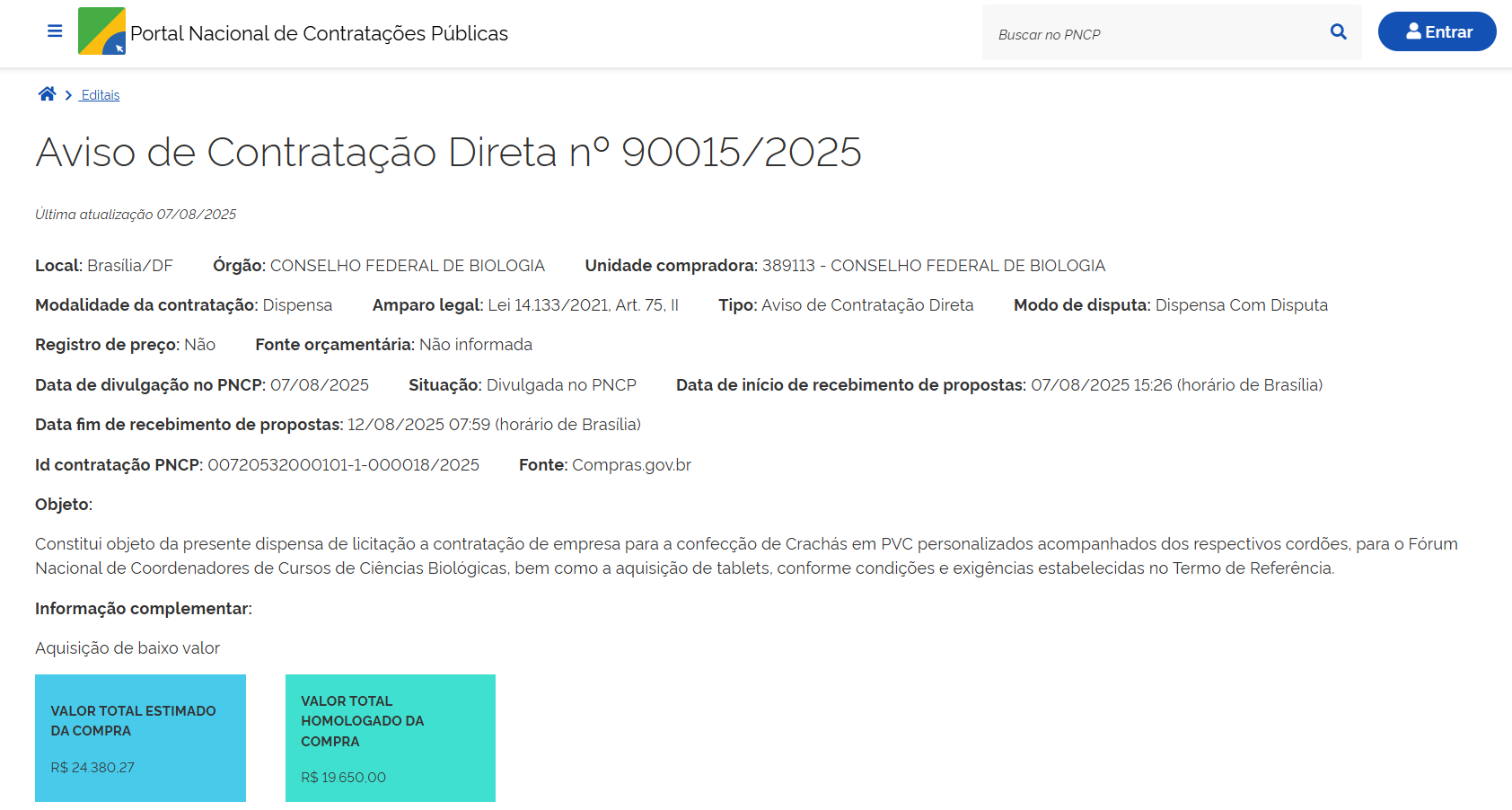 - Objeto: contratação de empresa para a confecção de Crachás em PVC personalizados acompanhados dos respectivos cordões, para o Fórum Nacional de Coordenadores de Cursos de Ciências Biológicas, bem como a aquisição de tablets.
