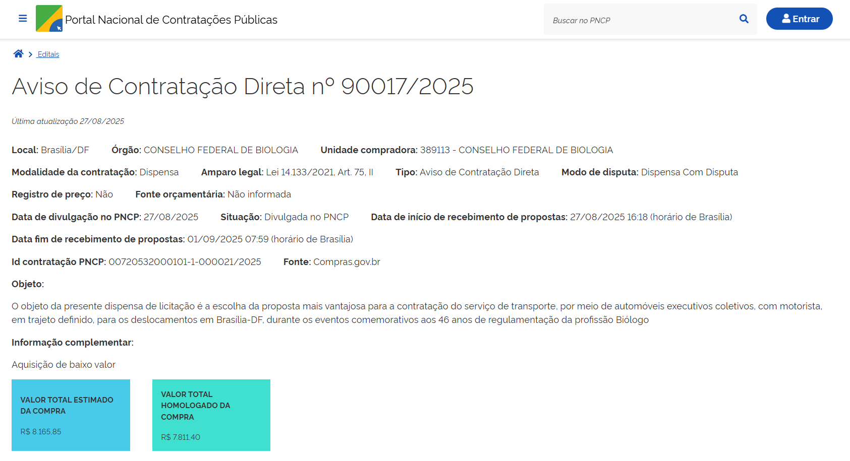 - Objeto: contratação do serviço de transporte, por meio de automóveis executivos coletivos, com motorista, em trajetos definidos, para os deslocamentos em Brasília-DF, durante os eventos comemorativos aos 45 anos de regulamentação da profissão Biólogo.