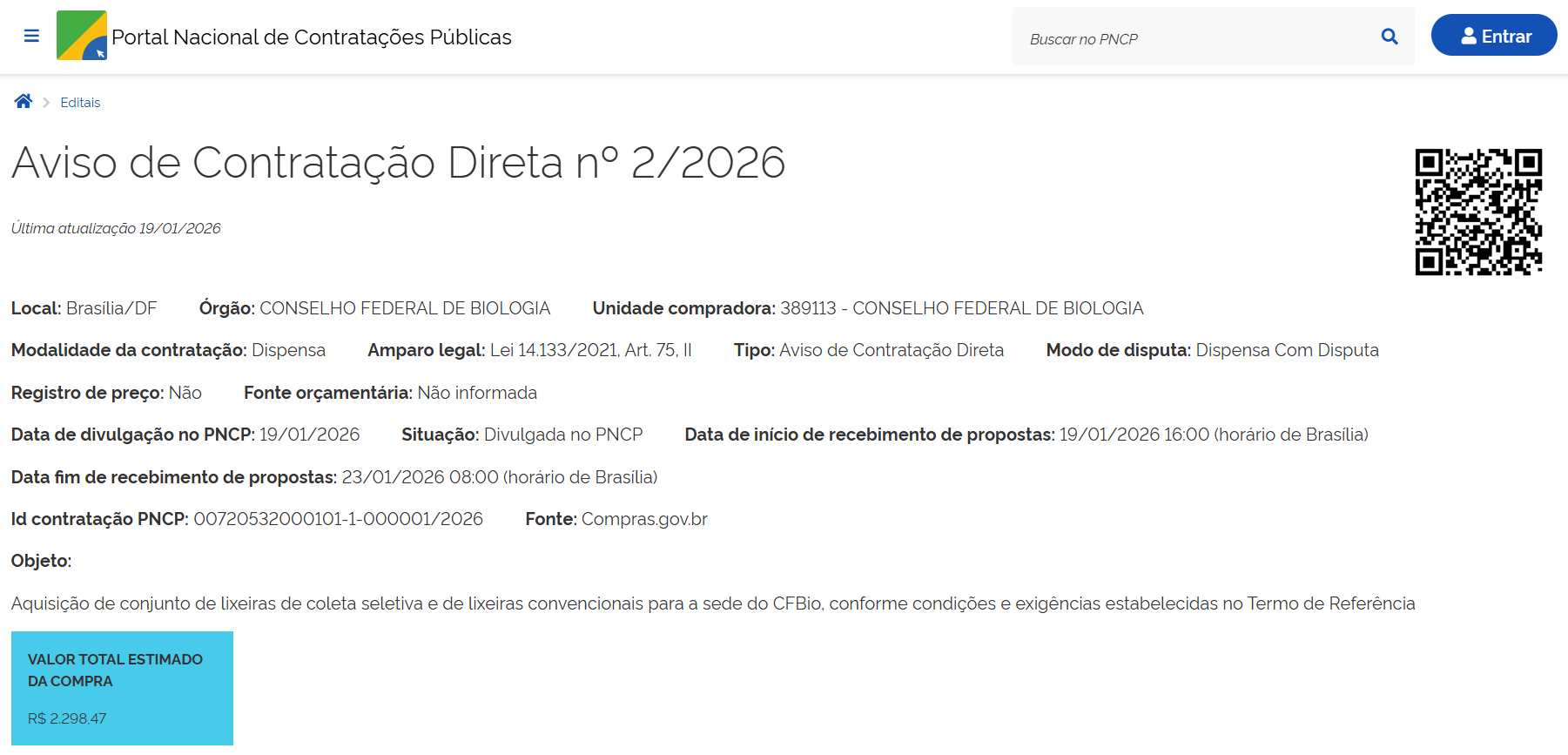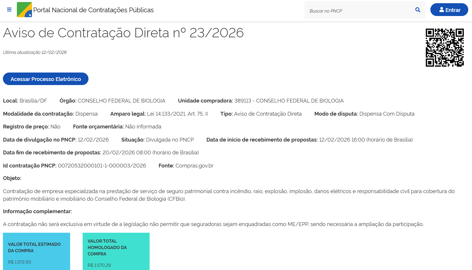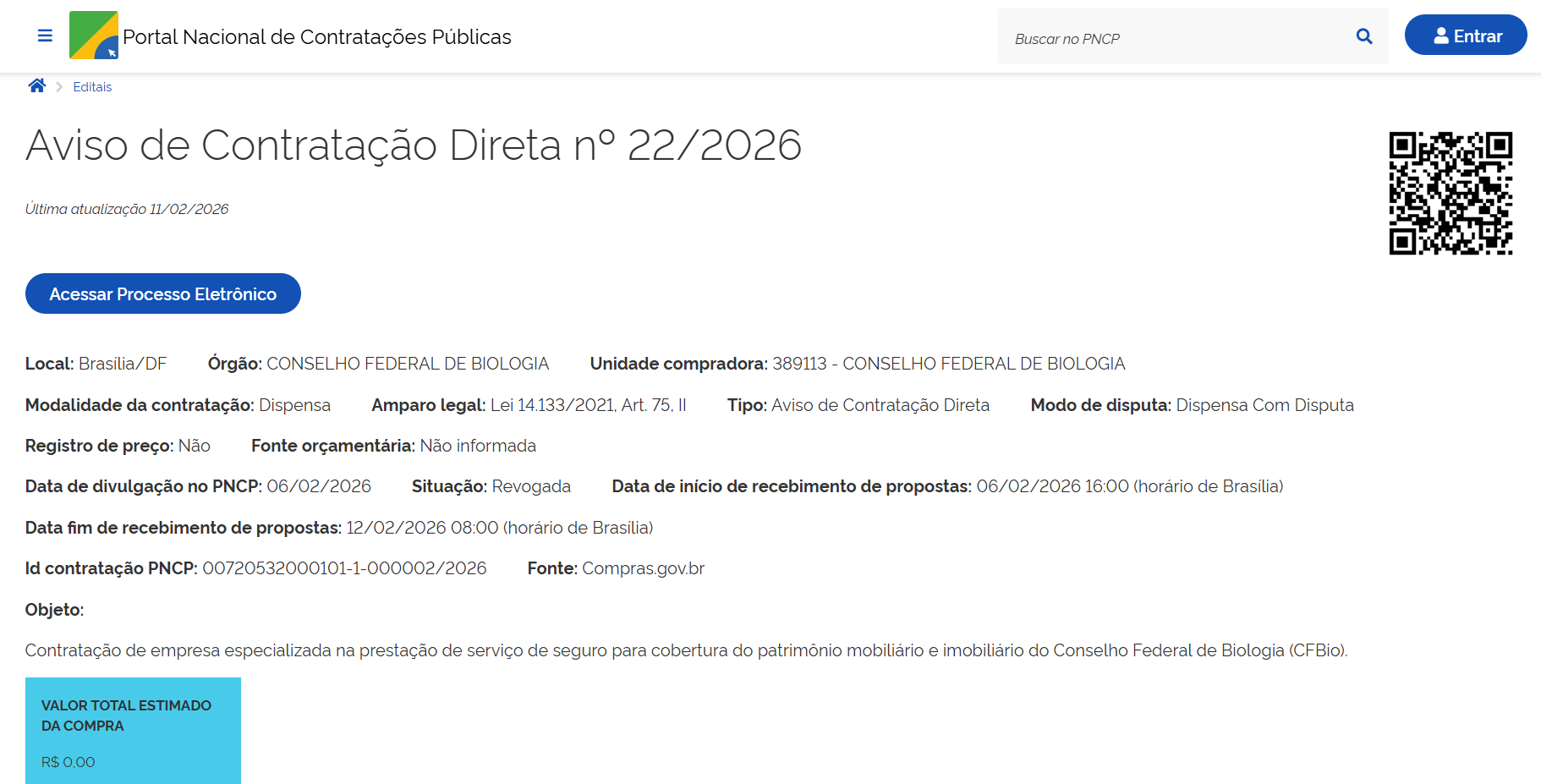 - Objeto: Contratação de empresa especializada na prestação de serviço de seguro para cobertura do patrimônio mobiliário e imobiliário do Conselho Federal de Biologia (CFBio).