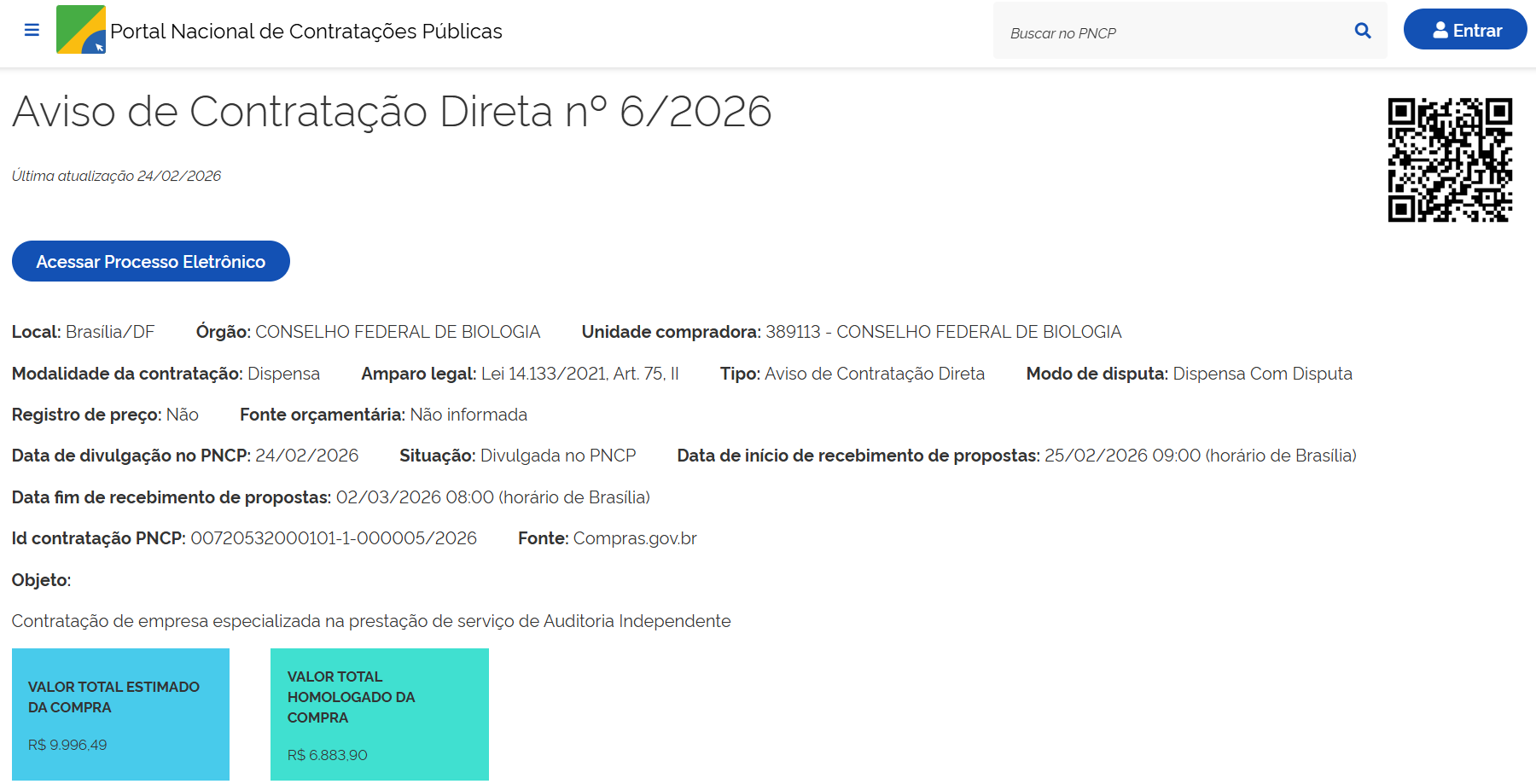 - Objeto: contratação de empresa especializada na prestação de serviço de Auditoria Independente (externa), a fim de atender as necessidades do Conselho Federal de Biologia - CFBio de certificação das demonstrações financeiras e contábeis apresentadas anualmente, referente ao exercício de 2025.
