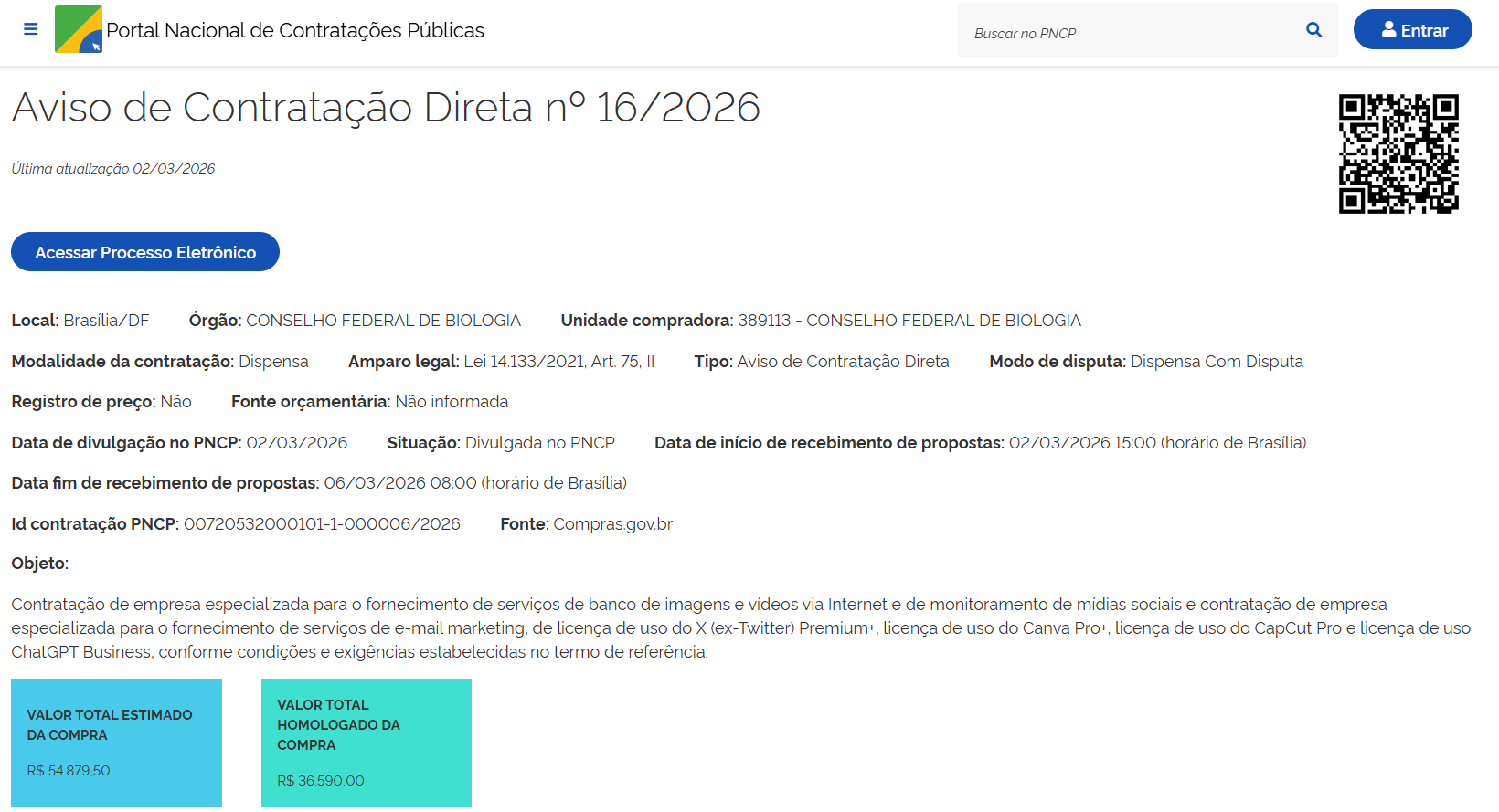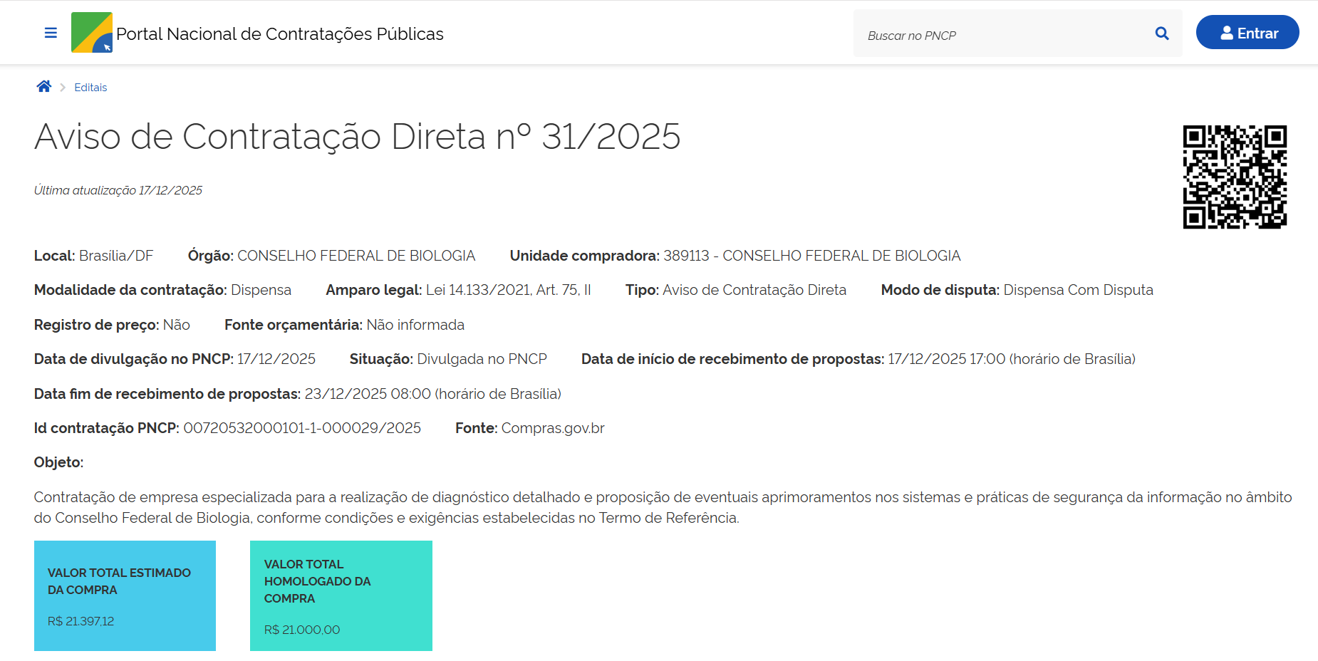 - Objeto: contratação de empresa especializada para a realização de diagnóstico detalhado e proposição de eventuais aprimoramentos nos sistemas e práticas de segurança da informação no âmbito do Conselho Federal de Biologia.